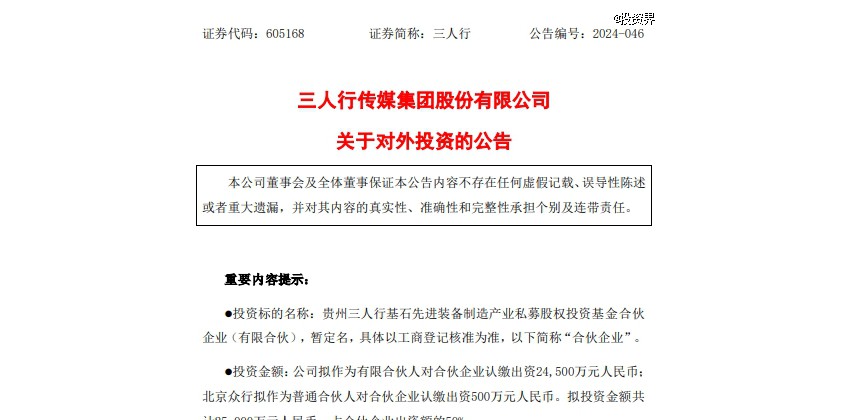 投資界-解碼LP獲悉,近日,三人行(SH:605168)發(fā)布公告,公司與北京眾行、北京先鋒基石股權(quán)投資管理合伙企業(yè)(有限合伙)(簡(jiǎn)...