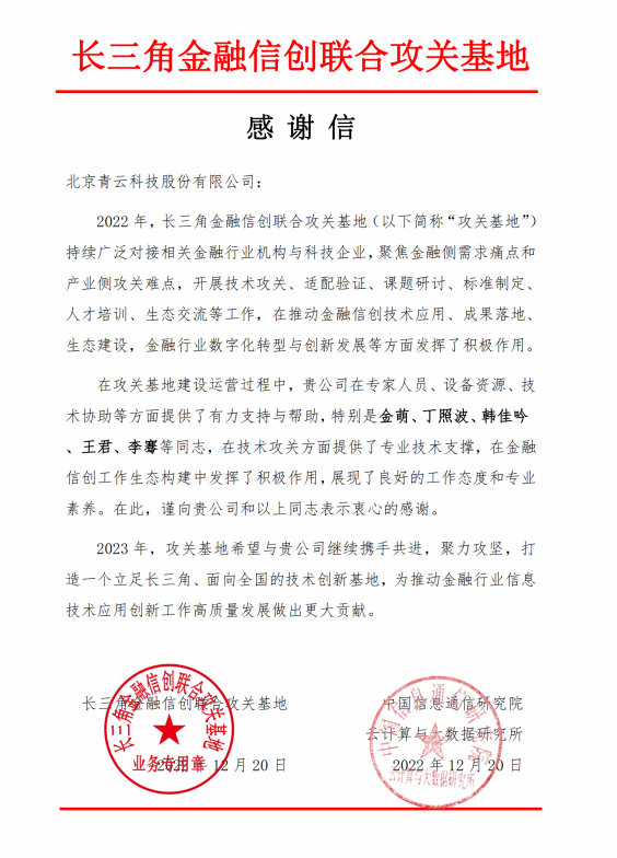 近日,中國(guó)信息通信研究院云計(jì)算與大數(shù)據(jù)研究所與長(zhǎng)三角金融信創(chuàng)聯(lián)合攻關(guān)基地(以下簡(jiǎn)稱:攻關(guān)基地)向青云科技發(fā)來(lái)感謝信。
