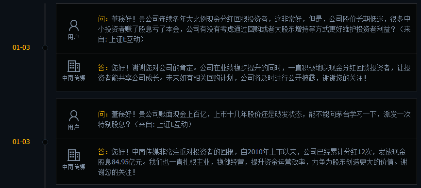 近期,有投資者在互動(dòng)平臺(tái)上提問(wèn):“公司連續(xù)多年大比例現(xiàn)金分紅回報(bào)投資者,這非常好,但是公司股價(jià)長(zhǎng)期低迷,很多中小投資者賺了股息虧了本金,公司有沒(méi)有考慮通過(guò)回購(gòu)或者大股東增持等方式更好維護(hù)投資者利益?”中南傳媒回應(yīng)稱,“未來(lái)如有相關(guān)回購(gòu)計(jì)劃,公司將及時(shí)進(jìn)行公開(kāi)披露。”