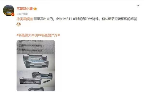 近日,一名擁有近50萬粉絲的微博汽車博主“不是鄭小康”在微博發(fā)布一則關于小米MS11車型的圖片,主要展示了小米汽車保險杠、小米MS11的裝飾件以及小米與北汽模塑相關合作細節(jié)等。