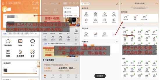 值得注意的是,用戶下拉屏幕可以進(jìn)入“二樓”查看/編輯功能組件,包括我的功能、快捷轉(zhuǎn)賬、最近使用、自選基金和熱門活動。其中,“我的功能”支持用戶自定義0-4個(gè)常用功能,但實(shí)際僅可顯示3個(gè),自定義旅程也有優(yōu)化空間:已經(jīng)選中的功能,“全部功能”中沒有進(jìn)行標(biāo)識。