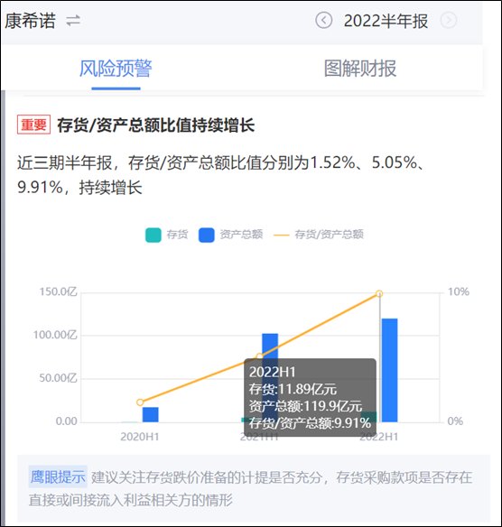 需要指出的是,疫苗由于有時效性,在需求大幅放緩之際,過高的存貨存在較大的減值風(fēng)險。值得主要的是,鷹眼預(yù)警顯示,公司的存貨呈現(xiàn)出持續(xù)走高態(tài)勢。2022年半年報,公司存貨占資產(chǎn)之比為9.91%,金額高達11.89億元。截止2022年三季報末,公司存貨降至8.8億元。從中或可以看出,康希諾下半年虧損或一大部分由存貨計提減值所致。