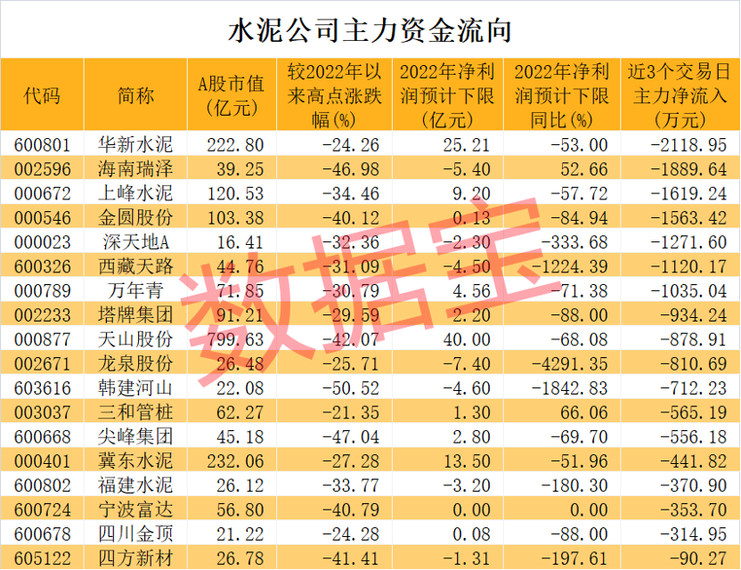 從資金面上來看,上述21家水泥公司中,兔年春節(jié)以來的3個交易日,7家公司主力凈流出額逾千萬元。其中金圓股份(000546)近3個交易日主力資金均為凈流出狀態(tài),合計凈流出達到1563萬元。與2022年以來高點相比,公司股價累計回撤幅度40.12%。