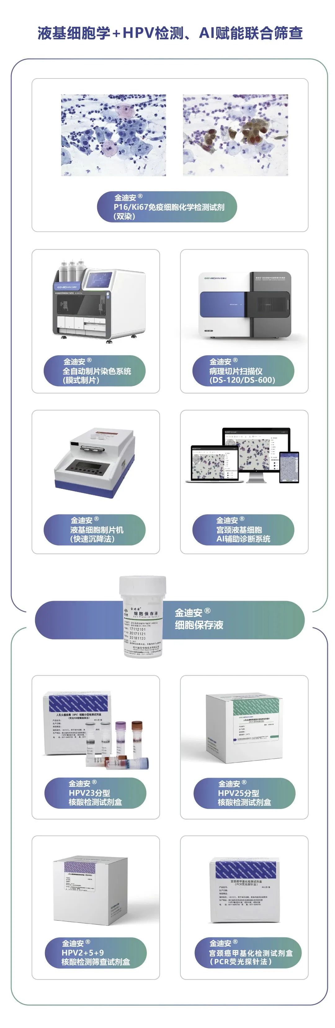 針對HPV病毒檢測,迪安生物可提供包含HPV檢測、液基細胞學檢測、AI輔助閱片系統(tǒng)的宮頸癌篩查整體解決方案。產(chǎn)品包括金迪安 人乳頭瘤病毒(HPV)核酸檢測、液基細胞學檢測系列產(chǎn)品,可實現(xiàn)從樣本采樣保存、HPV病毒核酸檢測及結(jié)果判讀、液基細胞制片染色及掃描+AI快速識別病變細胞的檢測全流程,為實現(xiàn)我國女性宮頸健康管理新目標助力。