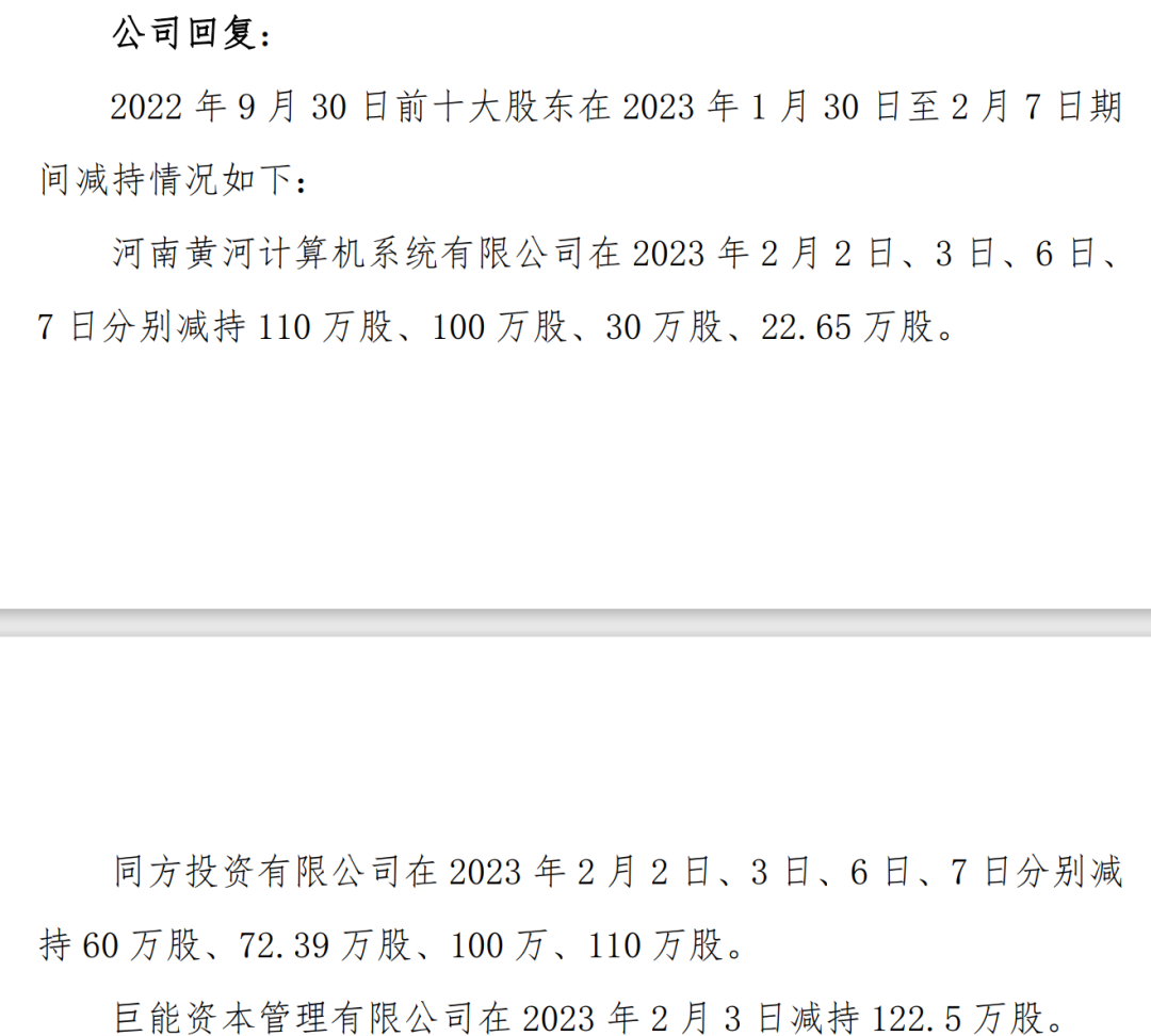 2022年三季報(bào)顯示,漢王科技前十大股東共計(jì)有4家機(jī)構(gòu)。從此次公司回復(fù)公告來看,在2023年1月30日至2月7日,即漢王科技此次“7連板”期間,公司前十大股東共計(jì)有3家機(jī)構(gòu)進(jìn)行了減持,合計(jì)減持727.54萬股。3家機(jī)構(gòu)具體減持情況如下: