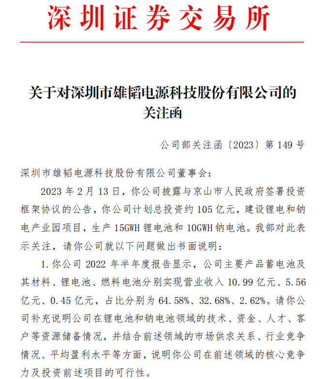 2月14日,雄韜股份(002733)(002733.SZ)收深交所關(guān)注函。雄韜股份2月13日公告稱,計(jì)劃準(zhǔn)備投資105億元建設(shè)鋰電池和鈉電池產(chǎn)業(yè)園項(xiàng)目,深交所要求雄韜股份說明在前述領(lǐng)域的核心競(jìng)爭(zhēng)力及投資前述項(xiàng)目的可行性。