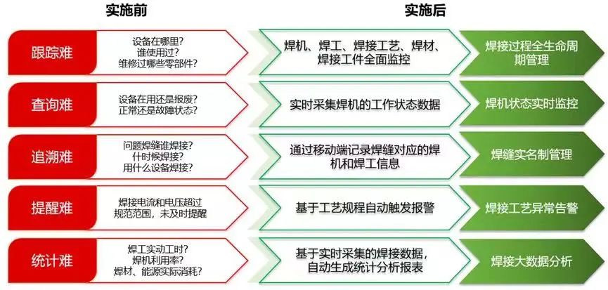 通過這一系統(tǒng)的應(yīng)用,只需要在屏幕上即可一覽車間所有焊機的實時工作狀態(tài),并實現(xiàn)焊接全生命周期的監(jiān)測和管理,實現(xiàn)焊縫實名制管理、焊接質(zhì)量追溯、焊接過程遠程監(jiān)控和焊接大數(shù)據(jù)分析,同時為管理者對人員和設(shè)備績效的考核、焊接工藝質(zhì)量分析、生產(chǎn)過程的資源調(diào)度優(yōu)化、設(shè)備的運行維護提供重要的支撐數(shù)據(jù)。