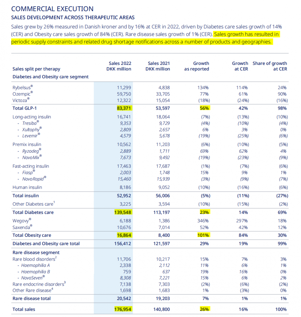 而諾和諾德的司美格魯肽減肥適應(yīng)癥產(chǎn)品Wegovy更是實(shí)現(xiàn)了三倍增長,財(cái)報(bào)顯示其2022年銷售額為61.88億丹麥克朗,同比增長346%。諾和諾德還表示,快速的銷售增長導(dǎo)致相關(guān)藥品短缺,對許多產(chǎn)品和地區(qū)進(jìn)行定期供應(yīng)。
