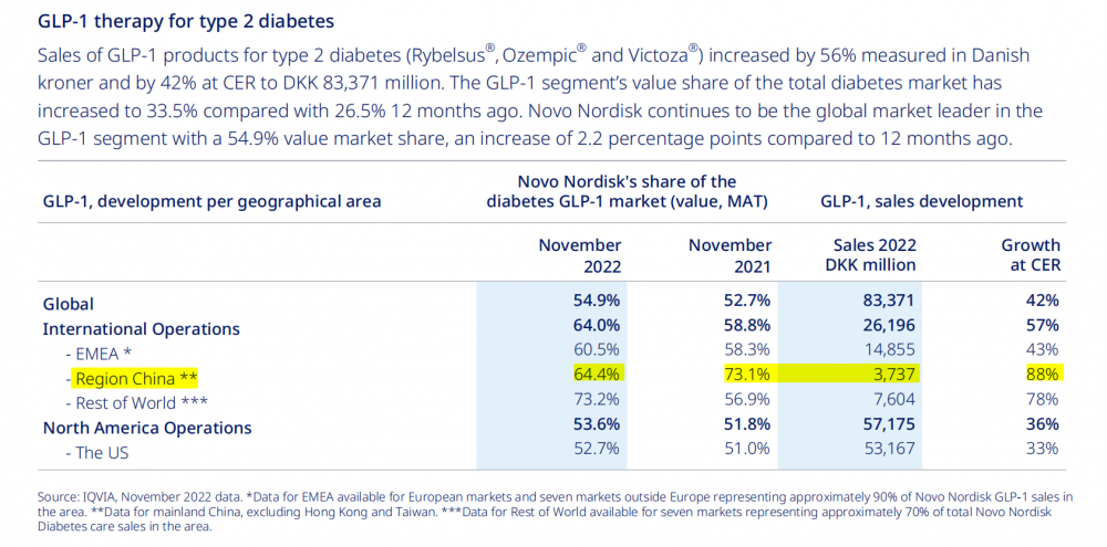 而諾和諾德所開發(fā)的利拉魯肽自問世以來,就成為了諾和諾德?lián)屨糋LP-1類似物的市場的“關(guān)鍵”。從諾和諾德2022年財(cái)報(bào)所公開的中國區(qū)銷售額中可以看出,諾和諾德GLP-1產(chǎn)品在中國的銷售額歸功于利拉魯肽(Victoza)、司美格魯肽注射劑(Ozempic)和司美格魯肽口服制劑(Rybelsus)。