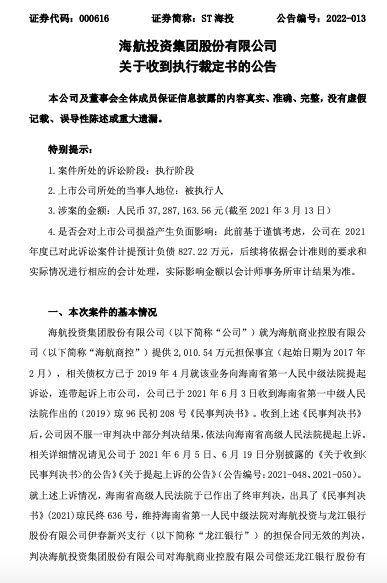 海航投資集團(tuán)股份有限公司(以下簡(jiǎn)稱“ST海投(000616)”或“公司”)2月23日發(fā)布關(guān)于收到執(zhí)行裁定書的公告。公告稱,公司于2023年2月20日收到由海南省人民檢察院送達(dá)的《通知書》,海南省人民檢察院受理因龍江銀行伊春新興支行不服海南省高級(jí)人民法院“龍江銀行金融借款合同糾紛案”民事判決向海南省人民檢察院申請(qǐng)監(jiān)督該案。公司于2023年2月21日收到海南省第一中級(jí)人民法院發(fā)來(lái)的《執(zhí)行裁定書》,海南省第一中級(jí)人民法院裁定駁回公司關(guān)于請(qǐng)求法院依法駁回龍江銀行的執(zhí)行申請(qǐng)的異議請(qǐng)求。本次涉案的金額:人民幣 37,287,163.56 元(截至 2021 年 3 月 13 日)。