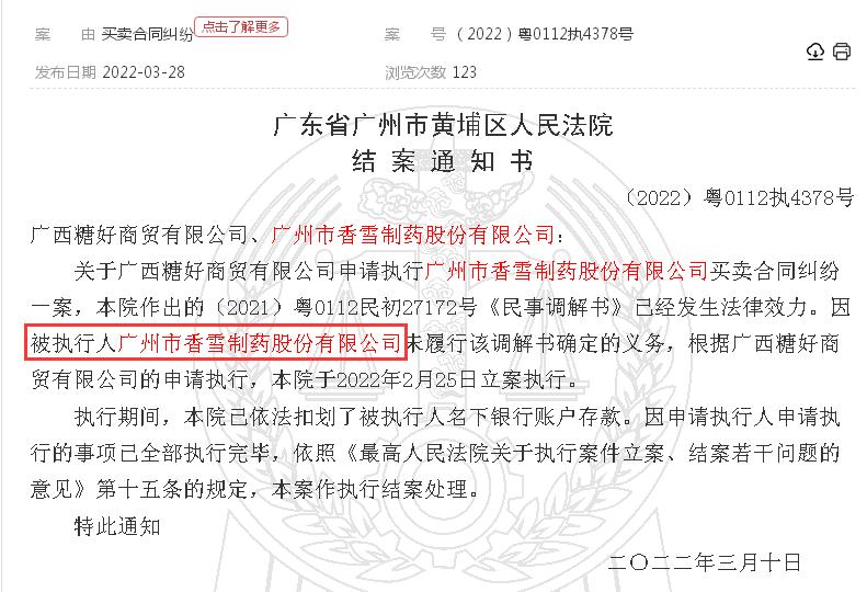 其中,《廣東省廣州市黃埔區(qū)人民法院結(jié)案通知書(2022)粵0112執(zhí)4378號》顯示,關(guān)于廣西糖好商貿(mào)有限公司申請執(zhí)行廣州市香雪制藥股份有限公司買賣合同糾紛一案,廣東省廣州市黃埔區(qū)人民法院作出的(2021)粵0112民初27172號《民事調(diào)解書》已經(jīng)發(fā)生法律效力。因被執(zhí)行人廣州市香雪制藥股份有限公司未履行該調(diào)解書確定的義務(wù),根據(jù)廣西糖好商貿(mào)有限公司的申請執(zhí)行,本院于2022年2月25日立案執(zhí)行。