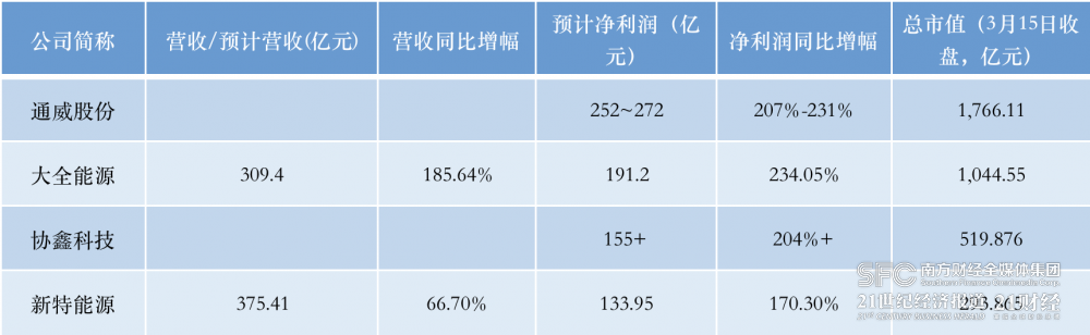 梳理發(fā)現(xiàn),目前,通威股份、協(xié)鑫科技、新特能源四家上市企業(yè)2022年歸母凈利潤(rùn)規(guī)模均在百億元以上,除了新特能源外,其余三家企業(yè)凈利潤(rùn)增速均在2倍以上,大全能源業(yè)績(jī)?cè)鏊倌壳芭琶谝弧?/p>
