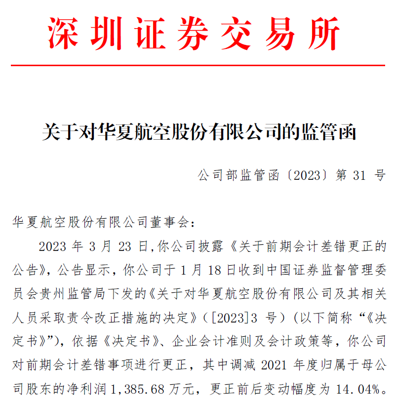根據(jù)華夏航空3月23日披露的《關(guān)于前期會(huì)計(jì)差錯(cuò)更正的公告》顯示,公司1月18日收到中國(guó)證券監(jiān)督管理委員會(huì)貴州監(jiān)管局下發(fā)的《關(guān)于對(duì)華夏航空股份有限公司及其相關(guān)人員采取責(zé)令改正措施的決定》([2023]3號(hào))。依據(jù)《決定書(shū)》、企業(yè)會(huì)計(jì)準(zhǔn)則及會(huì)計(jì)政策等,華夏航空對(duì)前期會(huì)計(jì)差錯(cuò)事項(xiàng)進(jìn)行更正,其中調(diào)減2021年度歸屬于母公司股東的凈利潤(rùn)1385.68萬(wàn)元,更正前后變動(dòng)幅度為14.04%。