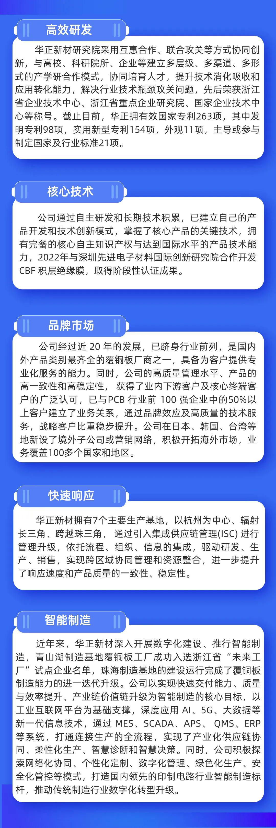 華正新材深耕CCL領(lǐng)域20余年,始終立足于高品質(zhì)、高標(biāo)準(zhǔn)的產(chǎn)品與服務(wù),自主設(shè)計(jì)、研發(fā)、生產(chǎn)及銷售覆銅板、半固化片、絕緣層壓板、金屬基覆銅箔板、涂樹(shù)脂銅箔、覆蓋膜類等高端電子材料。致力于成為高端電子基礎(chǔ)材料和特種復(fù)合材料等新材料應(yīng)用領(lǐng)域總體解決方案的提供商,堅(jiān)持技術(shù)引領(lǐng)發(fā)展,深度鏈接產(chǎn)業(yè)上下游,華正新材的主要核心優(yōu)勢(shì)包括:
