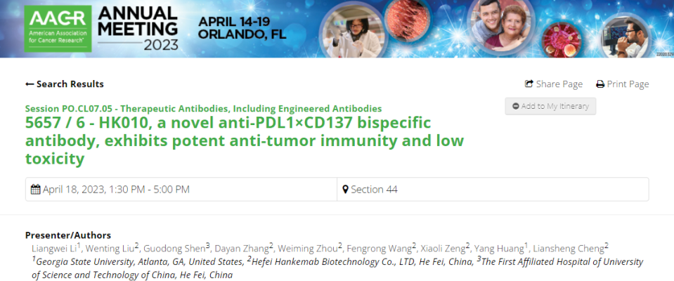 臨床前研究表明,HK010在動物腫瘤模型中顯示了強(qiáng)效的抗腫瘤活性。該雙抗增加兩個分子之間的親和力差異、弱化Fc功能,可以很好地平衡藥效和毒性,在猴子毒理研究中展現(xiàn)了極佳的安全性。HK010注射液已經(jīng)獲得了臨床試驗批件,并即將進(jìn)行首次人體試驗。本次會議海報將展示HK010最新臨床前數(shù)據(jù),歡迎業(yè)界同仁前來交流。