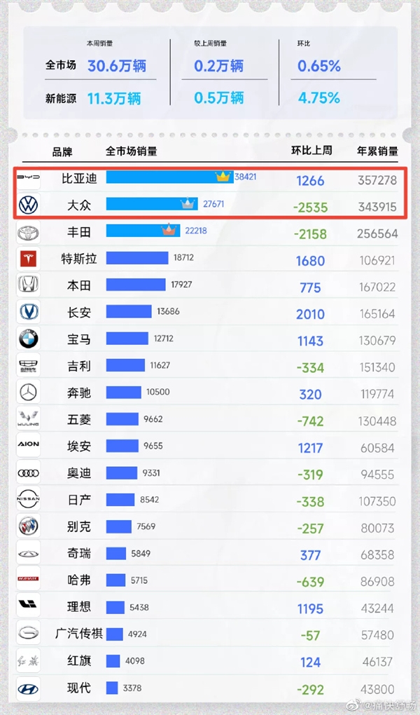 具體數(shù)據(jù)方面,本周,比亞迪2023年累計(jì)銷量357278輛,超越大眾(一汽大眾+上汽大眾)的343915輛。豐田以256564輛位居第三。