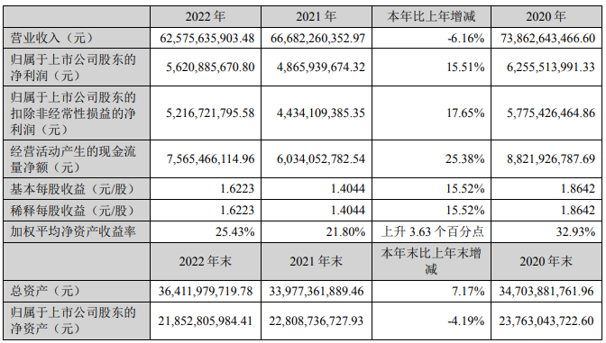雙匯發(fā)展于昨日晚間發(fā)布2022年年度報(bào)告,公司2022年實(shí)現(xiàn)營(yíng)業(yè)收入625.76億元,同比下降6.16%;歸屬于上市公司股東的凈利潤(rùn)為56.21億元,同比增長(zhǎng)15.51%;歸屬于上市公司股東的扣除非經(jīng)常性損益的凈利潤(rùn)為52.17億元,同比增長(zhǎng)17.65%;經(jīng)營(yíng)活動(dòng)產(chǎn)生的現(xiàn)金流量?jī)纛~為75.65億元,同比增加25.38%。