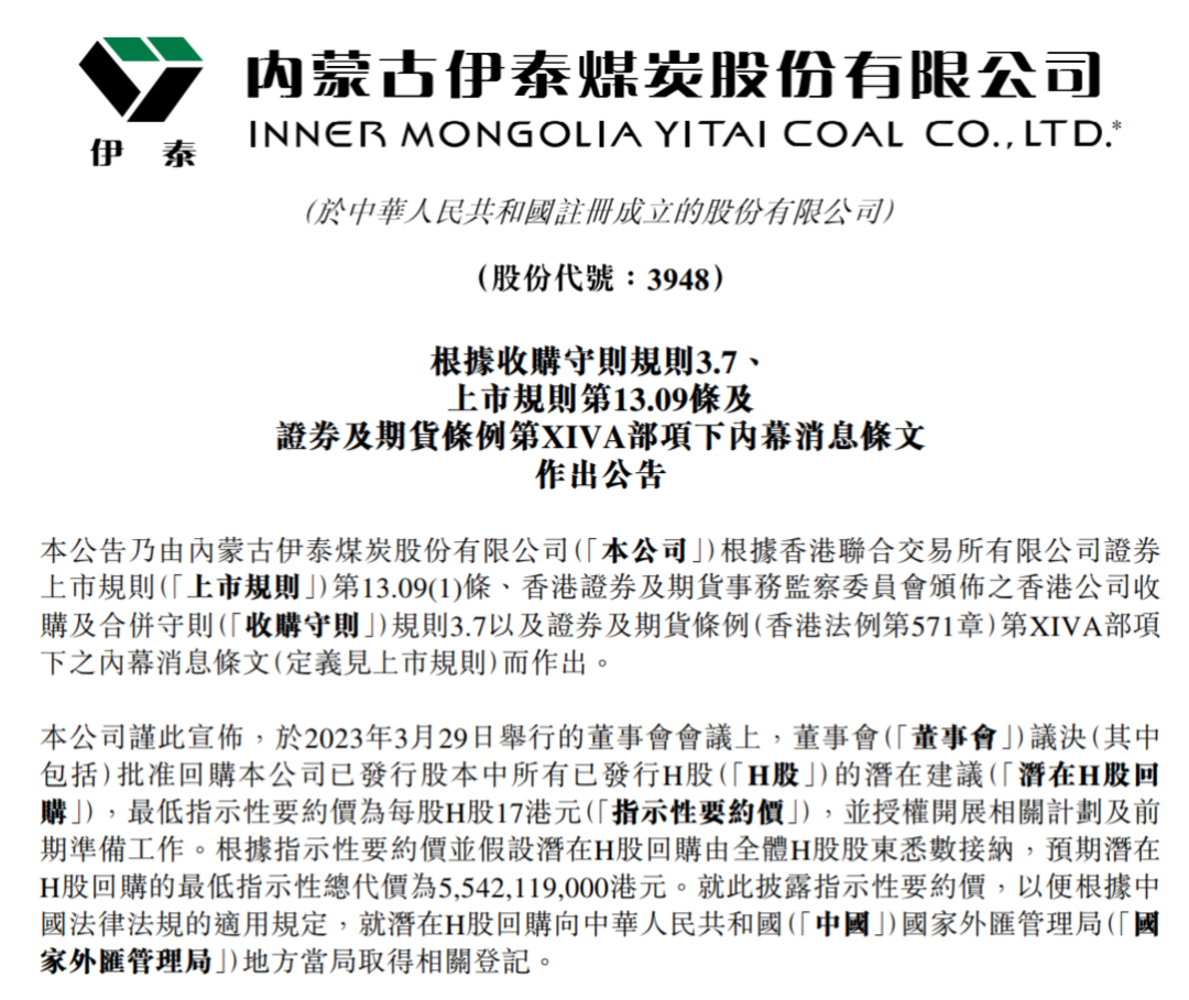 伊泰煤炭發(fā)布公告,于2023年3月29日舉行的董事會會議上,董事會議決批準(zhǔn)回購公司已發(fā)行股本中所有已發(fā)行H股的潛在建議(潛在H股回購),最低指示性要約價為每股H股17港元(指示性要約價),并授權(quán)開展相關(guān)計(jì)劃及前期準(zhǔn)備工作。根據(jù)指示性要約價并假設(shè)潛在H股回購由全體H股股東悉數(shù)接納,預(yù)期潛在H股回購的最低指示性總代價為55.42億港元。就此披露指示性要約價,以便根據(jù)中國法律法規(guī)的適用規(guī)定,就潛在H股回購向中國國家外匯管理局地方當(dāng)局取得相關(guān)登記。