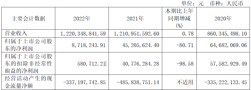 華光新材昨日披露2022年年度報告。去年公司實現(xiàn)營業(yè)收入12.20億元,同比增長0.78%;歸屬于上市公司股東的凈利潤871.82萬元,同比下降80.71%;歸屬于上市公司股東的扣除非經(jīng)常性損益的凈利潤58.07萬元,同比下降98.58%;經(jīng)營活動產(chǎn)生的現(xiàn)金流量凈額為-3.37億元,上年同期為-4.86億元。
