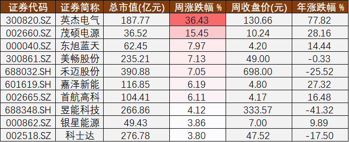 其中,英杰電氣(300820)(300820.SZ)、茂碩電源(002660)(002660.SZ)、東旭藍天(000040)(000040.SZ)在板塊內領漲,周漲幅為36.43%、15.45%、7.97%。