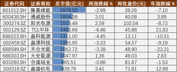 本周市值居前的光伏龍頭股 制圖: