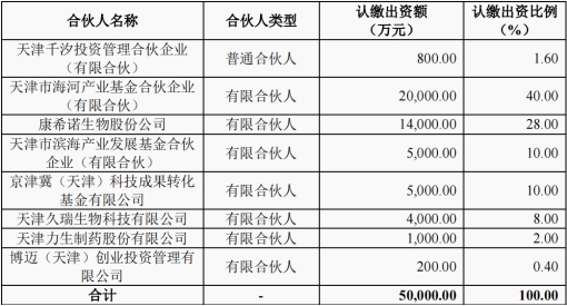依據(jù)公告,康希諾此次參與設(shè)立的基金名稱(chēng)為“元希海河(天津)生物醫(yī)藥產(chǎn)業(yè)基金合伙企業(yè)(有限合伙)”(簡(jiǎn)稱(chēng)“元希海河基金”),成立于2023年4月20日,基金規(guī)模5億元,共有8名投資人(如下圖)。