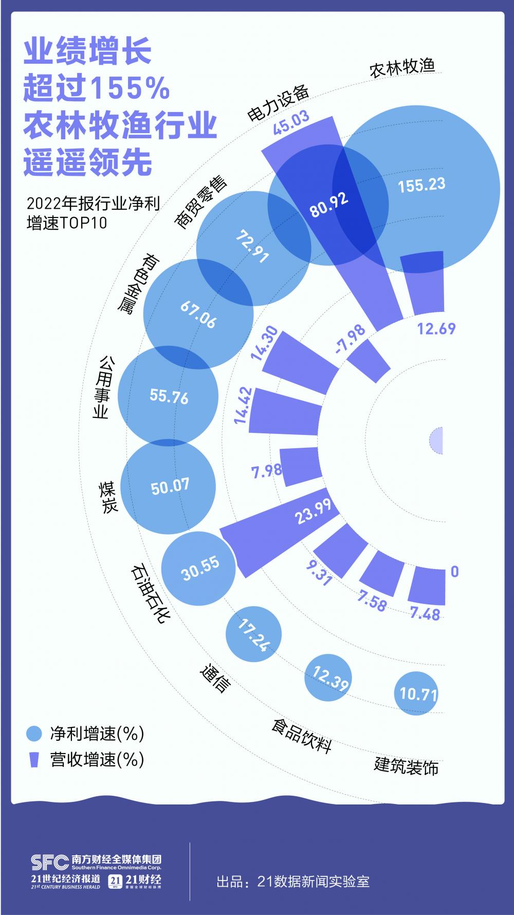 在個股凈利增速TOP10中,前9家公司的增幅均超過20倍。增幅最大的是農尚環(huán)境(300536),2022年凈利同比大增53倍,成功扭虧為盈,實現(xiàn)凈利潤2347萬元。