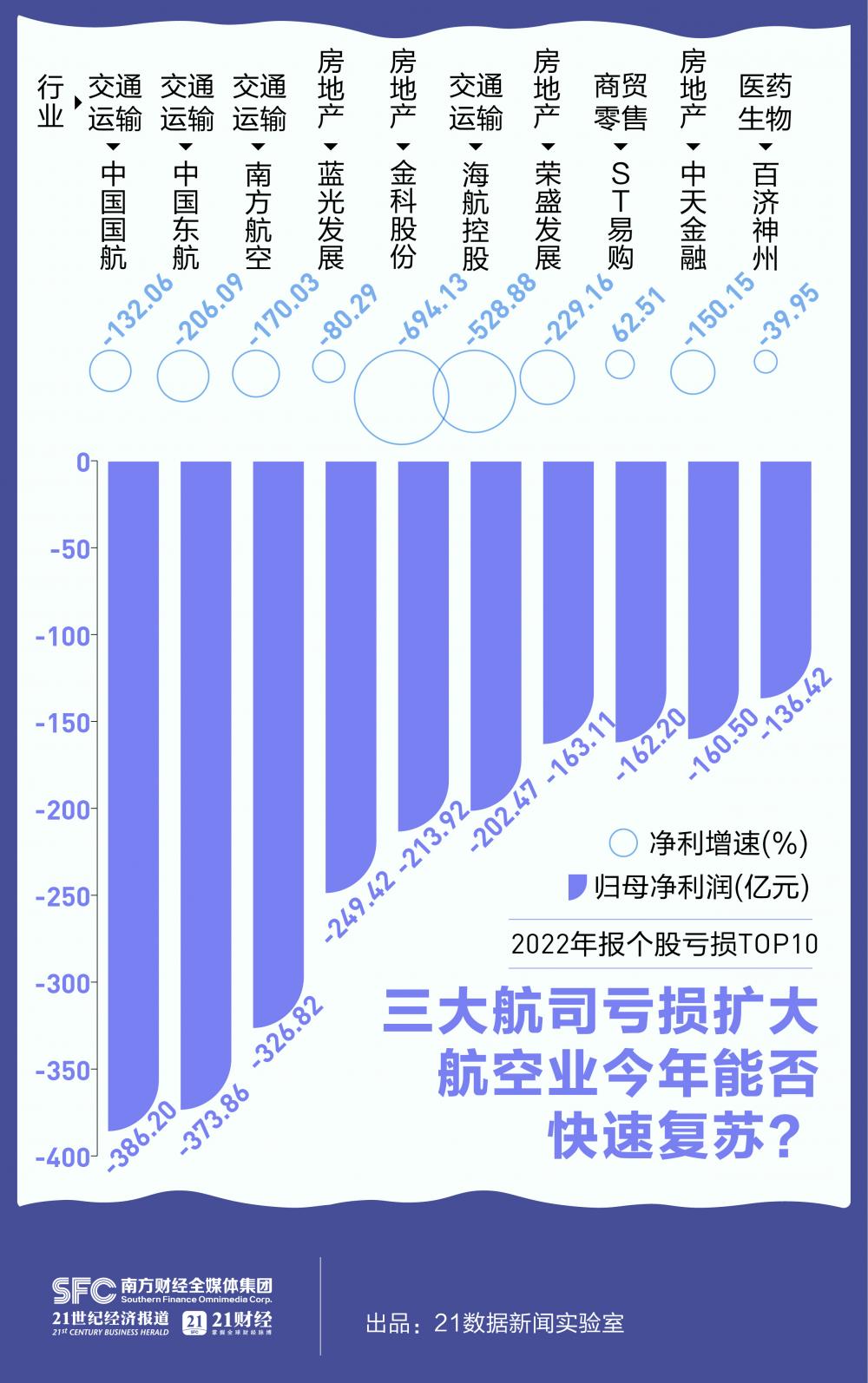 在個股虧損TOP10中,有5家公司來自航空業(yè)。作為國內航空業(yè)代表的“三大航司”,中國國航(601111)、中國東航(600115)、南方航空(600029)2022年虧損額繼續(xù)擴大,均超過300億元,刷新最高虧損記錄。此外,海航控股(600221)由盈轉虧,凈利同比下滑529%,錄得202億元凈虧損。