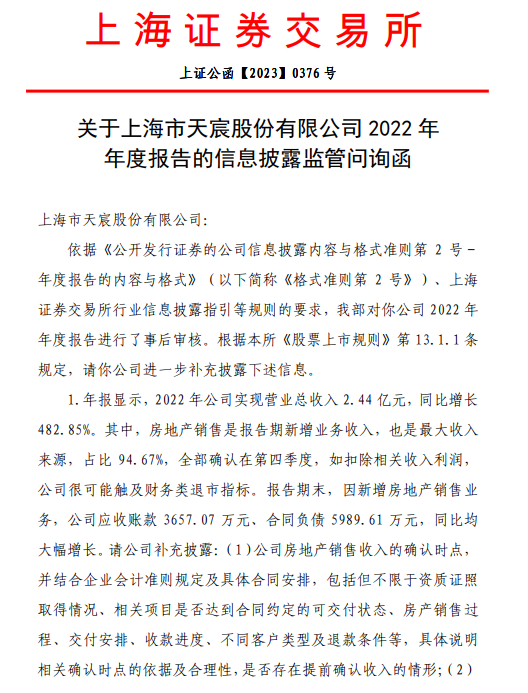 在年報(bào)披露后,天宸股份收到了上交所下發(fā)的問詢函。上交所要求其補(bǔ)充說明公司房地產(chǎn)銷售收入的確認(rèn)時(shí)點(diǎn),并結(jié)合企業(yè)會(huì)計(jì)準(zhǔn)則規(guī)定及具體合同安排,具體說明相關(guān)確認(rèn)時(shí)點(diǎn)的依據(jù)及合理性,是否存在提前確認(rèn)收入的情形;主要房地產(chǎn)客戶資金來源,核實(shí)相關(guān)資金軌跡是否涉及公司及潛在關(guān)聯(lián)方,是否存在關(guān)聯(lián)交易非關(guān)聯(lián)化、收入確認(rèn)不具備商業(yè)實(shí)質(zhì)的情形;應(yīng)收賬款前五名客戶情況、是否涉及關(guān)聯(lián)方或利益相關(guān)方,并結(jié)合具體業(yè)務(wù)模式,包括但不限于建造、銷售、收款流程等,說明相關(guān)應(yīng)收賬款及合同負(fù)債的性質(zhì),是否符合一般房地產(chǎn)銷售慣例;公司房地產(chǎn)銷售業(yè)務(wù)是否屬于未形成或難以形成穩(wěn)定業(yè)務(wù)模式的業(yè)務(wù)、與主營業(yè)務(wù)無關(guān)或不具備商業(yè)實(shí)質(zhì)業(yè)務(wù),是否存在應(yīng)扣除收入的情況。