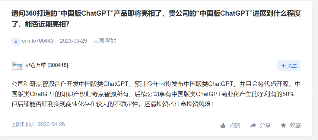 公司和奇點智源合作開發(fā)中國版類 ChatGPT,預計今年內將發(fā)布中國版類 ChatGPT,并且會將代碼開源。中國版類 ChatGPT 的知識產權歸奇點智源所有,后續(xù)公司享有中國版類 ChatGPT 商業(yè)化產生的凈利潤的 50%,但后續(xù)能否順利實現(xiàn)商業(yè)化存在較大的不確定性,還請投資者注意投資風險!