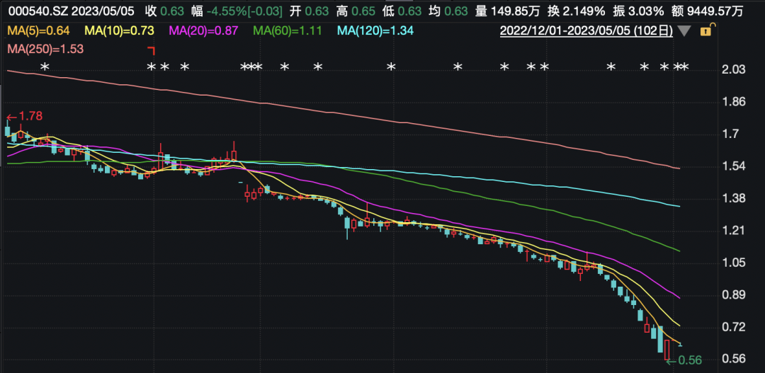 5月5日,復(fù)牌交易的首個(gè)交易日,*ST中天(000540)股價(jià)收盤跌停,報(bào)0.63元,已連續(xù)11個(gè)交易日跌破股票面值。據(jù)記者測(cè)算,即使未來(lái)9個(gè)交易日,公司股價(jià)每天都以漲停價(jià)收盤,仍無(wú)法在第20個(gè)交易日站上1元,由此也觸及“1元退市”情形。