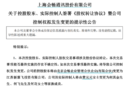 5月7日,會暢通訊一紙公告宣布,該公司控股股東北京會暢企業(yè)管理合伙企業(yè)(有限合伙)(會暢企管)和實控人黃元元擬將以10.53億元將所持有的27%股份全部予以轉(zhuǎn)讓,完成轉(zhuǎn)讓后,江蘇新霖飛投資有限公司(新霖飛)將入主這家昔日大牛股。