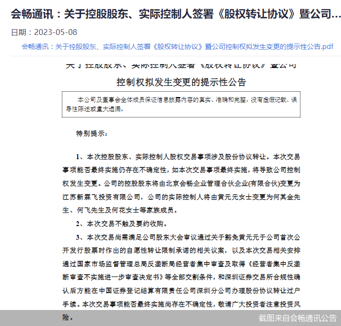 5月7日晚間,會暢通訊一紙公告宣布公司控制權(quán)將發(fā)生變更。