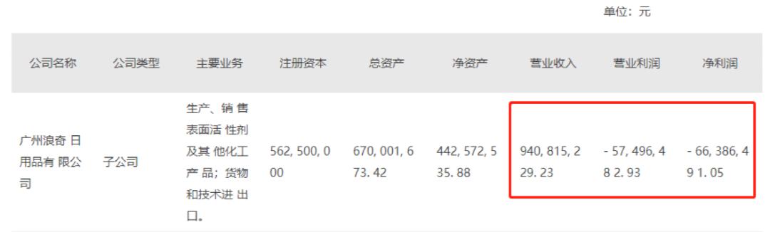 2022年年報(bào)顯示,公司日化板塊的銷量下滑16.43%,庫存增長近10%,主要產(chǎn)品洗衣粉、液體洗滌劑、陰離子表面活性劑的產(chǎn)能利用率分別只有78%、60%、60%。主力公司廣州浪奇日用品有限公司(即“南沙浪奇”)去年?duì)I業(yè)收入9.41億元,凈利潤虧損6638.6萬元,而廣州浪奇去年凈利潤虧損額是7161萬元,也就是說日化板塊的虧損占公司整體虧損在九成以上。