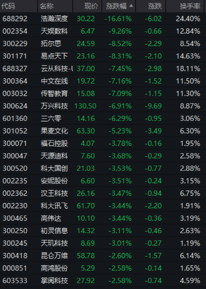 人工智能板塊持續(xù)走弱,AIGC、ChatGPT方向領跌,浩瀚深度盤中20CM跌停,天娛數(shù)科(002354)逼近跌停,拓爾思(300229)、云從科技、中文在線(300364)等熱門股跌超5%。