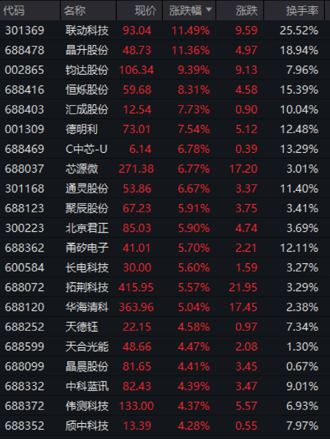 此外,芯片、半導體板塊震蕩反彈,存儲芯片方向領漲。聯(lián)動科技(301369)、晶升股份漲超11%,鈞達股份(002865)、匯成股份等均漲超7%。