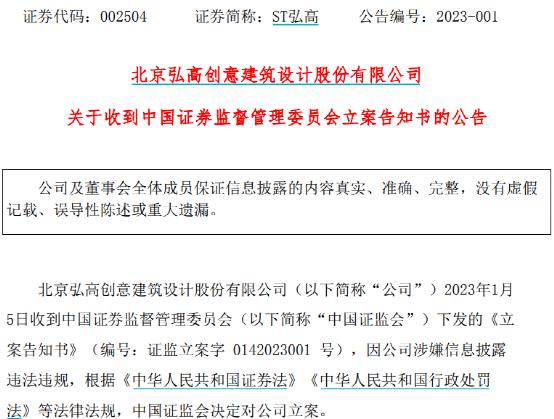 今年1月5日,公司公告稱,收到中國證監(jiān)會下發(fā)的《立案告知書》(編號:證監(jiān)立案字 0142023001 號),因公司涉嫌信息披露違法違規(guī),中國證監(jiān)會決定對公司立案。