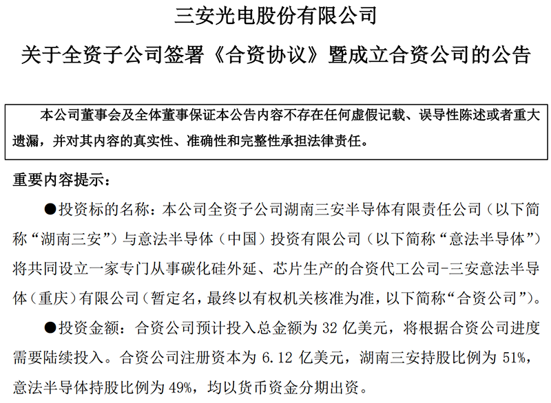 根據(jù)公告,該合資項目公司暫定名為“三安意法半導體(重慶)有限公司”,注冊資本6.12億美元,其中由三安光電全資子公司湖南三安持股51%,意法半導體(中國)投資有限公司持股49%(均以貨幣資金分期出資)。項目預計投資總額達32億美元,在取得各項手續(xù)批復后開始建設,計劃于2025年完成階段性建設并逐步投產(chǎn),2028年達產(chǎn),規(guī)劃達產(chǎn)后生產(chǎn)8英寸碳化硅晶圓10000片/周。