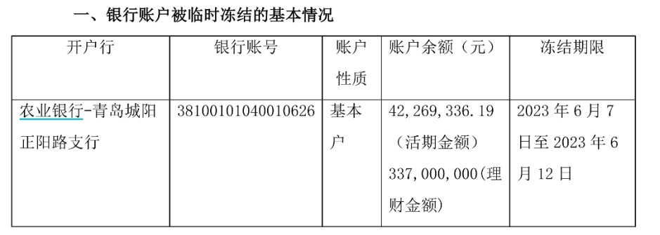 海利爾公告披露,該凍結賬戶開戶行為“ 農業(yè)銀行-青島城陽正陽路支行”,賬戶余額包括活期金額4226.93萬元和理財金額3.37億元,凍結期限為2023年6月7日至2023年6月12日。