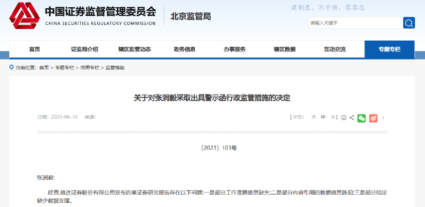 北京證監(jiān)局指出,信達(dá)證券發(fā)布的某證券研究報告存在以下問題:一是部分工作底稿信息缺失;二是部分內(nèi)容引用的數(shù)據(jù)信息陳舊;三是部分結(jié)論缺少數(shù)據(jù)支撐。張潤毅作為該研究報告署名證券分析師,對研究報告內(nèi)容負(fù)有直接責(zé)任。
