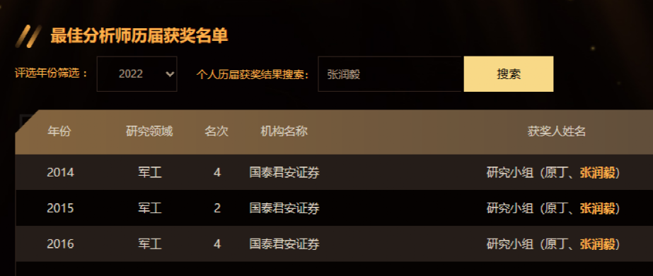 據(jù)了解,張潤毅的研究方向?yàn)閲儡姽ぃ?014-2016年在國泰君安工作期間,曾多次登榜新財富最佳分析師評選,曾為國泰君安軍工行業(yè)首席分析師。