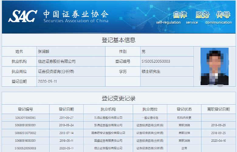 中證協(xié)信息顯示,張潤毅曾在東海證券、國泰君安、國盛證券等券商從事研究業(yè)務(wù),其中2013年至2018年在國泰君安研究所工作,工作時間最長。2020年5月加入信達(dá)證券,任職至今。