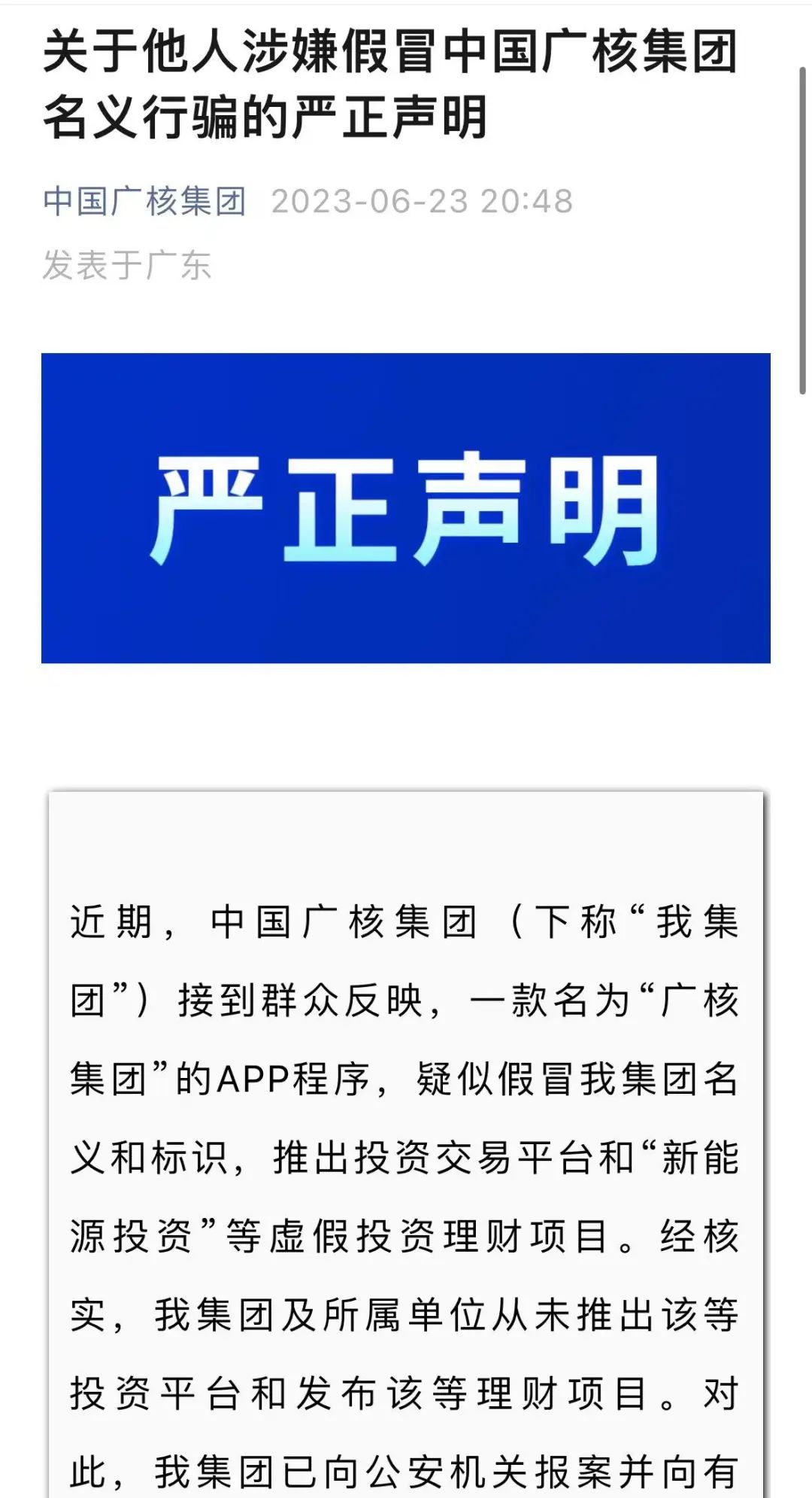 6月23日晚間,據(jù)“中國廣核(003816)集團”微信公眾號消息,中國廣核集團發(fā)布嚴正聲明:“近期,中國廣核集團接到群眾反映,一款名為‘廣核集團’的APP程序,疑似假冒我集團名義和標識,推出投資交易平臺和‘新能源投資’等虛假投資理財項目。經(jīng)核實,我集團及所屬單位從未推出該等投資平臺和發(fā)布該等理財項目。對此,我集團已向公安機關報案并向有關行政機關舉報?!?/p>