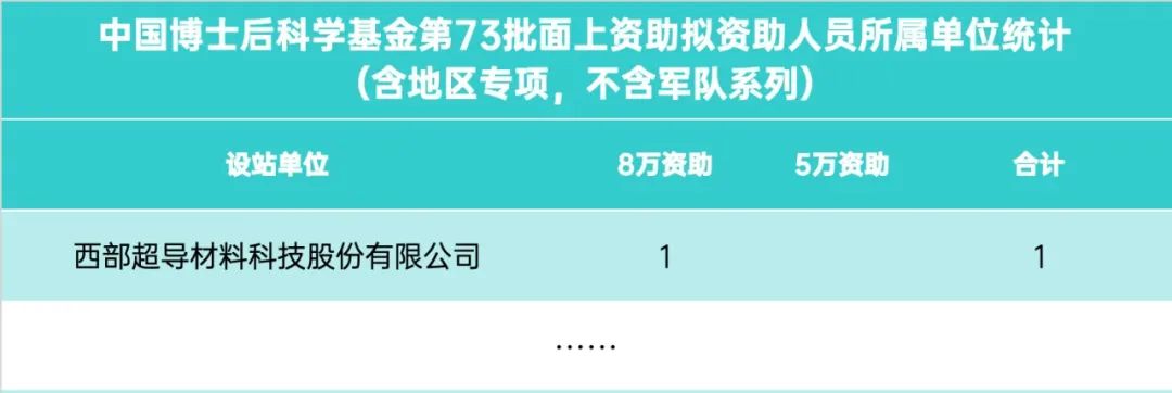 根據(jù)《關(guān)于對中國博士后科學(xué)基金第73批面上資助擬資助人員名單進(jìn)行公示的通知》(中博基字〔2023〕8號),經(jīng)評選并認(rèn)定,共有4004位擬資助人員入選(軍隊(duì)系統(tǒng)擬資助人員未公開名單),其中包含西部超導(dǎo)材料科技股份有限公司博士后科研工作站1人。