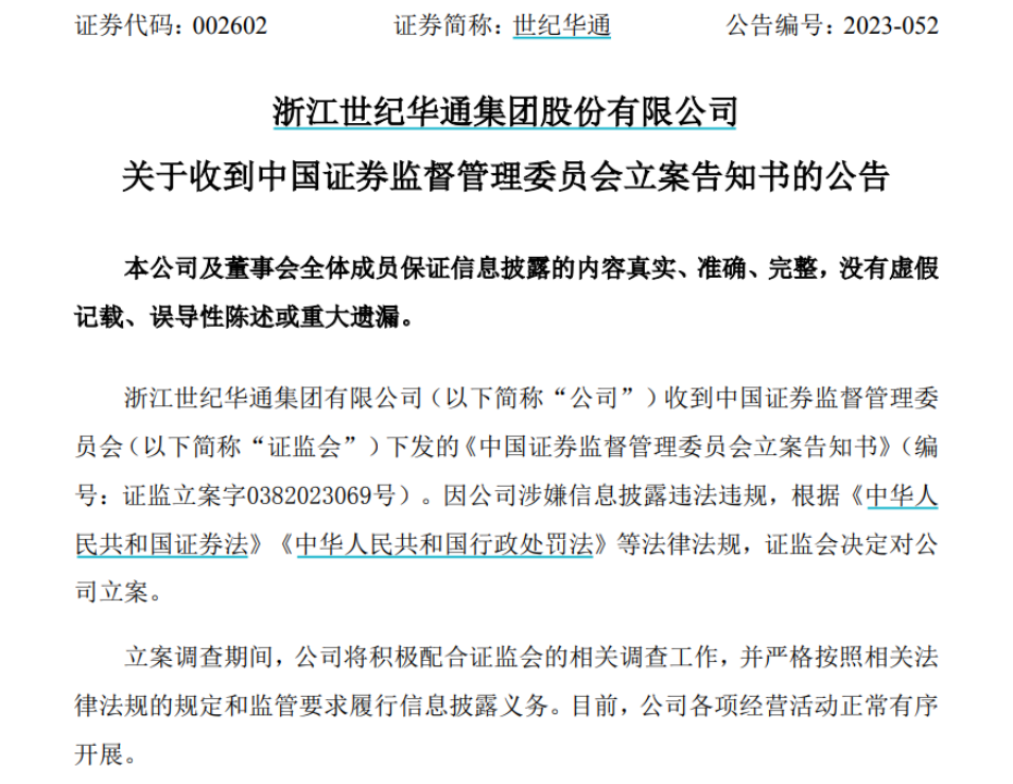 7月24日,世紀(jì)華通收到證監(jiān)會下發(fā)的《中國證券監(jiān)督管理委員會立案告知書》(編號:證監(jiān)立案字0382023069號)。因公司涉嫌信息披露違法違規(guī),根據(jù)《中華人民共和國證券法》《中華人民共和國行政處罰法》等法律法規(guī),證監(jiān)會決定對公司立案。
