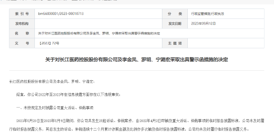 2023年,長藥控股存在重大債務到期未清償?shù)那樾?,合計金額超過公司最近一期經(jīng)審計凈資產(chǎn)(歸屬于母公司所有者權(quán)益)絕對值的20%,公司未及時履行信息披露義務。
