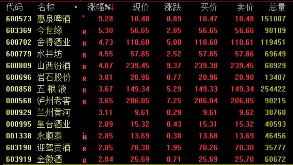 酒類股今日反彈走高,截至收盤(pán),惠泉啤酒漲約9%,今世緣(603369)漲超5%,舍得酒業(yè)、水井坊、山西汾酒等漲超4%,五糧液(000858)漲超3%,貴州茅臺(tái)(600519)漲超2%。
