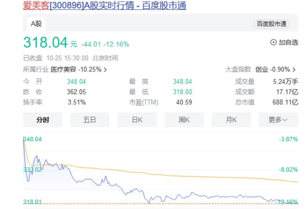 值得注意的是,昨晚剛公布三季報(bào)的愛(ài)美客開(kāi)盤(pán)即大幅下探,收盤(pán)下跌12.16%報(bào)318.04元,股價(jià)較年初高點(diǎn)已“腰斬”,最新市值688億元。
