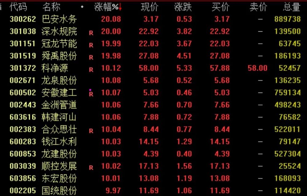 水利板塊盤(pán)中爆發(fā),個(gè)股掀漲停潮。截至收盤(pán),巴安水務(wù)、深水規(guī)院、冠龍節(jié)能、舜禹股份(301519)等“20cm”漲停,龍泉股份(002671)、安徽建工(600502)、金洲管道、錢江水利(600283)等亦漲停。