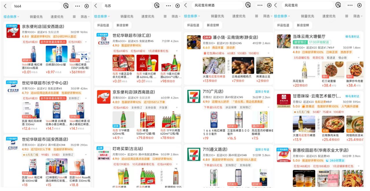 從餓了么平臺看,定位上海、廣州某市中心位置,以1664、烏蘇、風(fēng)花雪月為關(guān)鍵詞檢索,包括便利店、酒小二、商超、云南特色餐廳在內(nèi)的諸多店鋪提供30分鐘以內(nèi)的送達服務(wù)。當(dāng)中部分還有0.01元的500毫升/620毫升的明星單品福利引流。而去年三季報時,李志剛就談到很多到家訂單由用戶周邊的超市、便利店支持。希望加大啤酒可見度,推廣啤酒套餐。